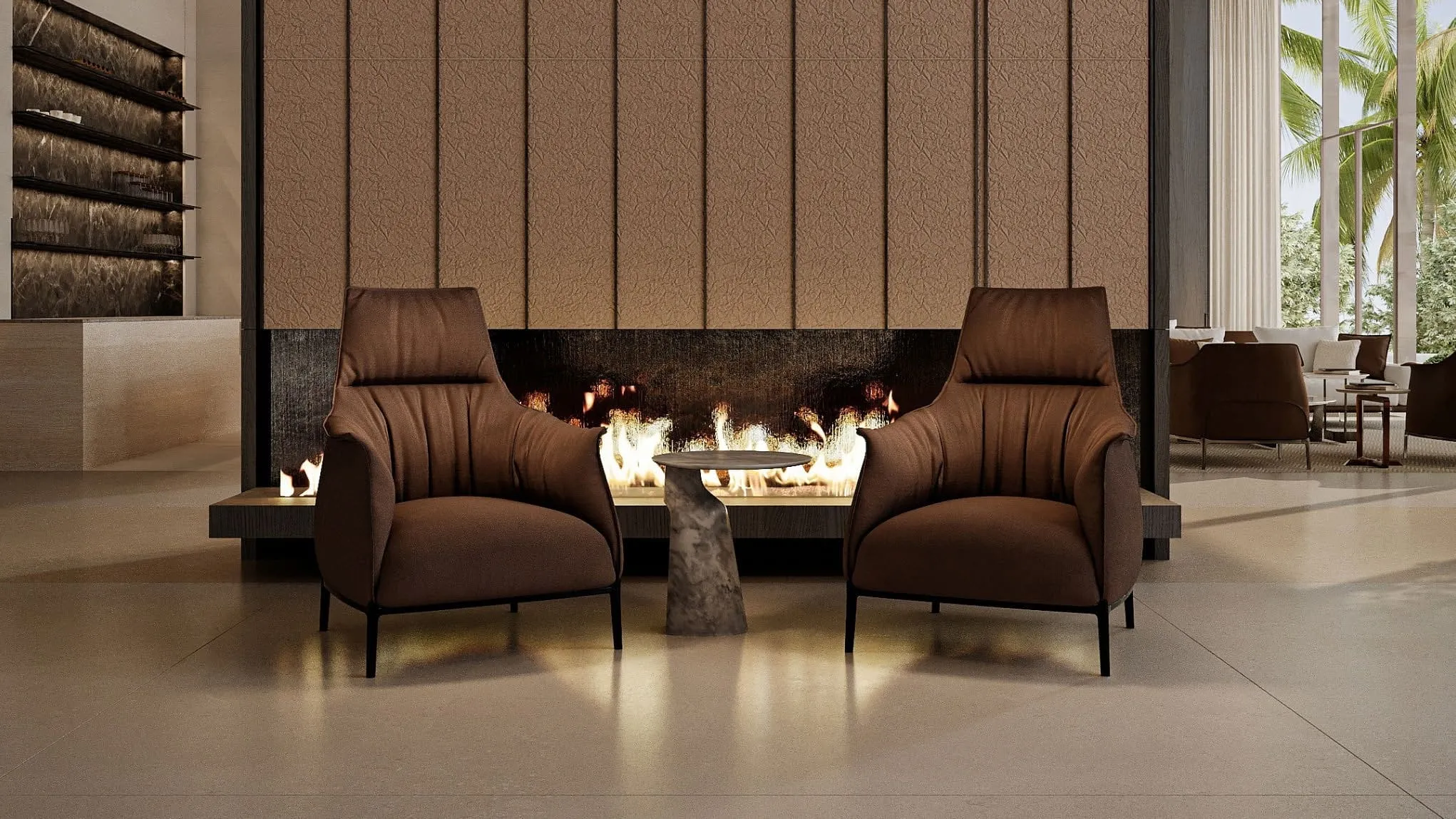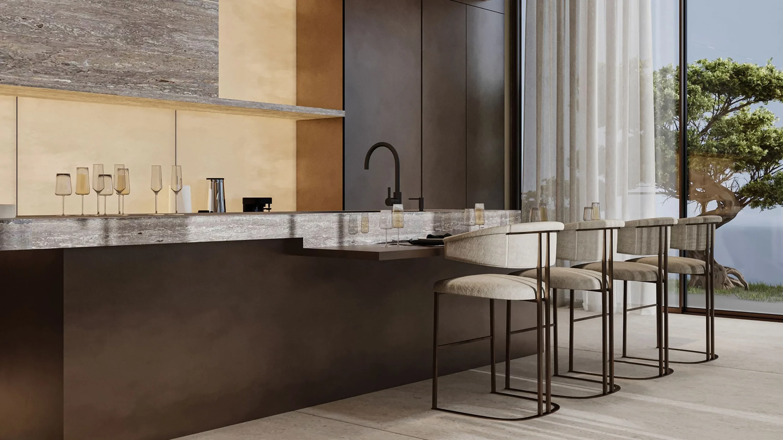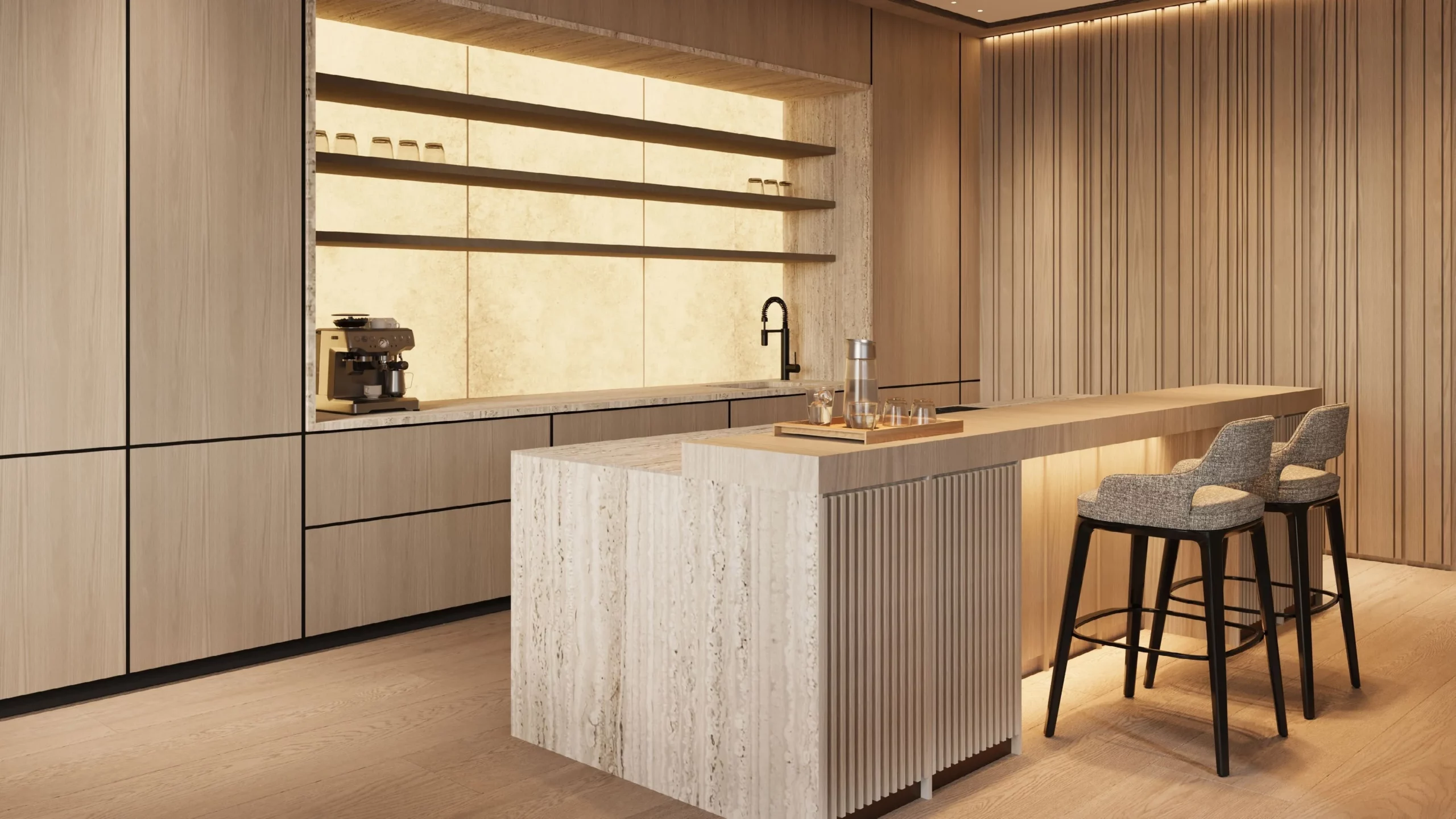 Omoria Private Residences is an ultra-luxury boutique development by Innovate Living, located on the waterfront of Dubai Islands. The project offers a limited collection of bespoke residences, including studios, 1- to 4-bedroom apartments, duplexes, and signature penthouses, all furnished with custom Italian furniture and featuring natural stone finishes, travertine, bronze accents, and warm wood tones.