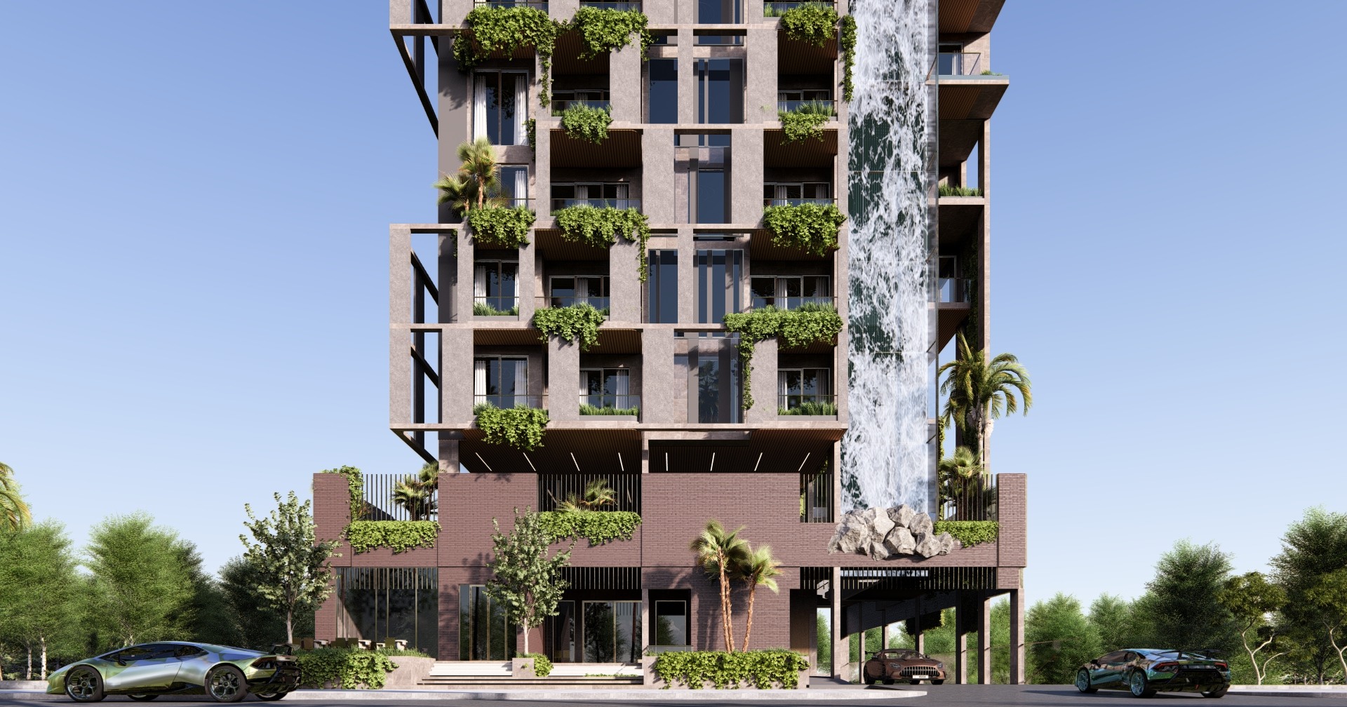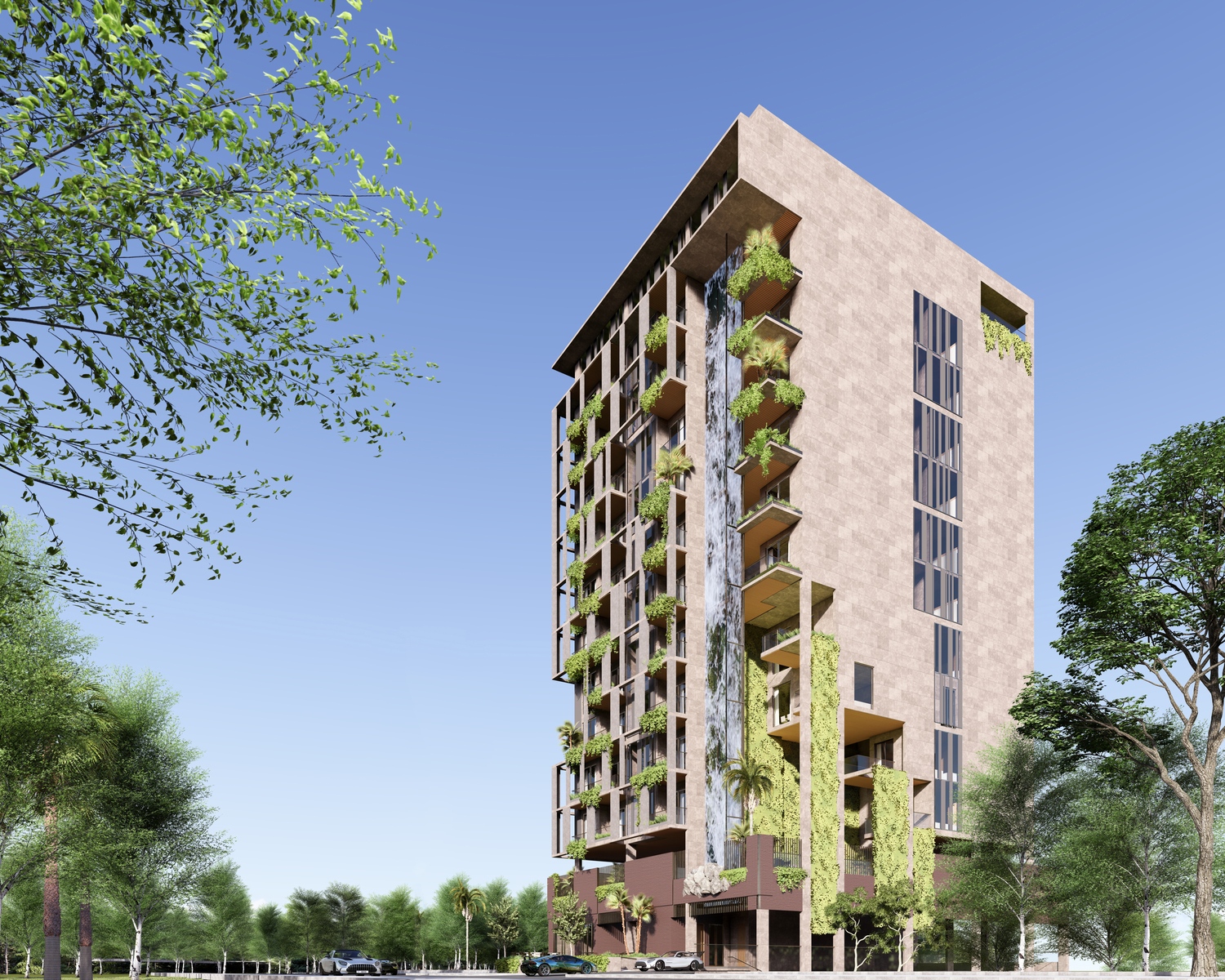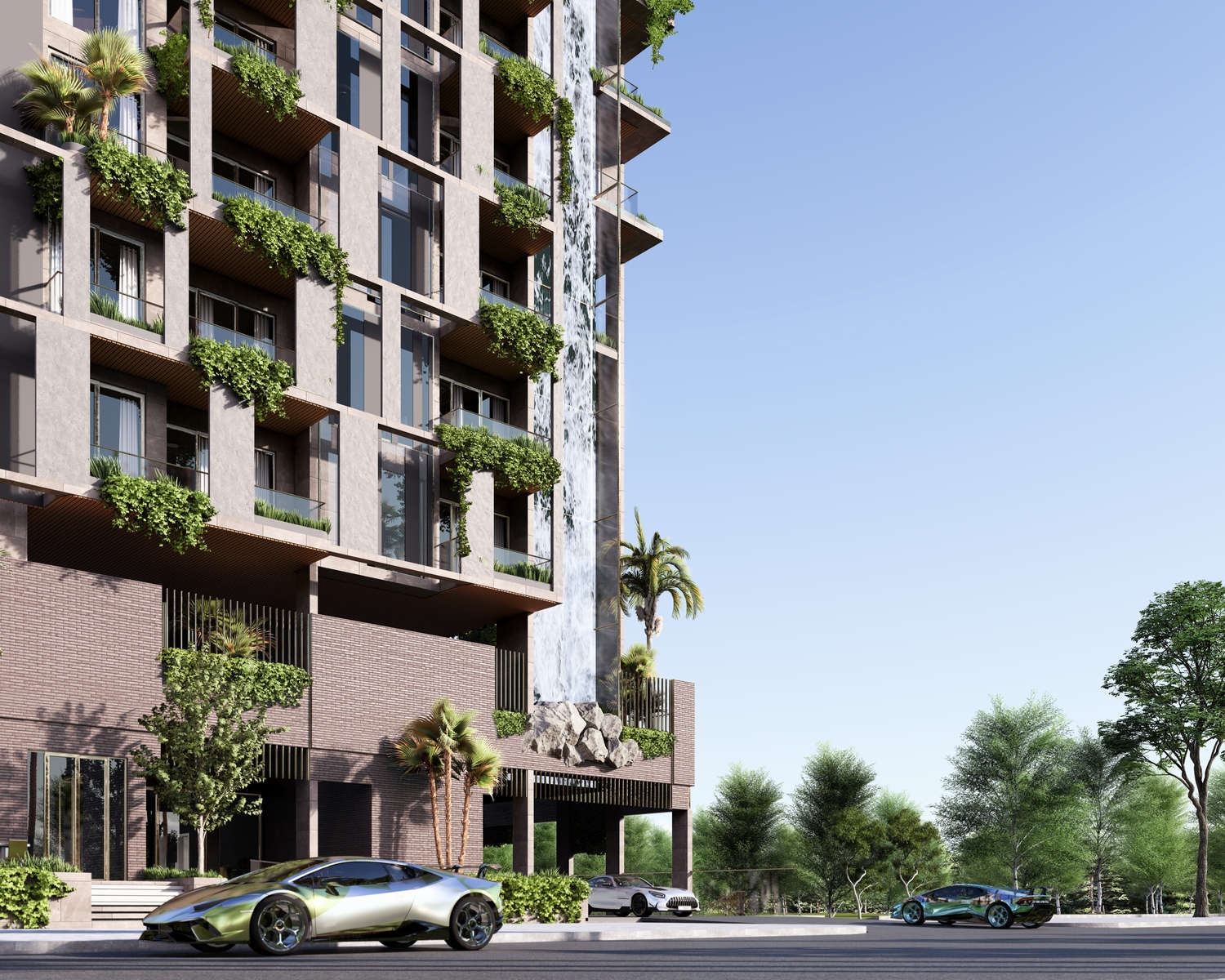 Amazonia Residence offre un parfait équilibre entre design moderne et intégration naturelle, proposant des appartements de 1 et 2 chambres ainsi que des penthouses luxueux de 3 chambres. Ce projet résidentiel se distingue par sa façade en briques rouges saisissante, accentuée par des éléments en bois chaleureux et des garde-corps en verre élégant, incarnant une sophistication contemporaine. La verdure soigneusement intégrée renforce l’ambiance paisible, fusionnant harmonieusement le bâtiment avec son environnement naturel. Ce mélange réfléchi de matériaux et de paysages crée un cadre de vie accueillant, durable, et visuellement captivant.