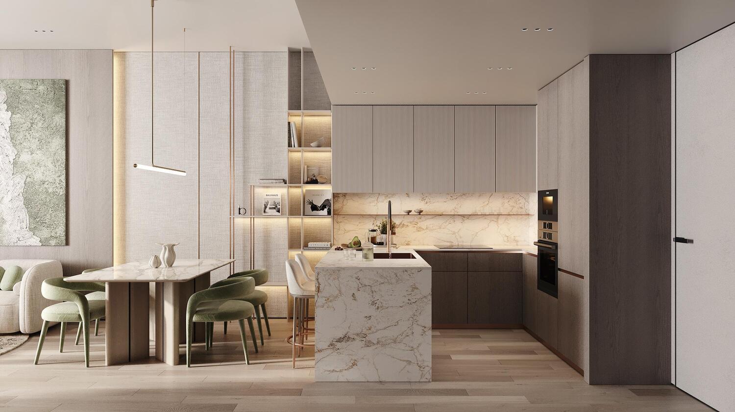 Pensés pour répondre aux attentes d’une clientèle en quête de raffinement, tous les appartements sont entièrement meublés, avec des finitions soignées, une palette de couleurs neutres et un agencement optimisé. Les grandes baies vitrées laissent entrer généreusement la lumière naturelle tout en ouvrant sur des vues dégagées et reposantes. Grâce aux systèmes domotiques intégrés, chaque logement allie confort moderne et praticité au quotidien.