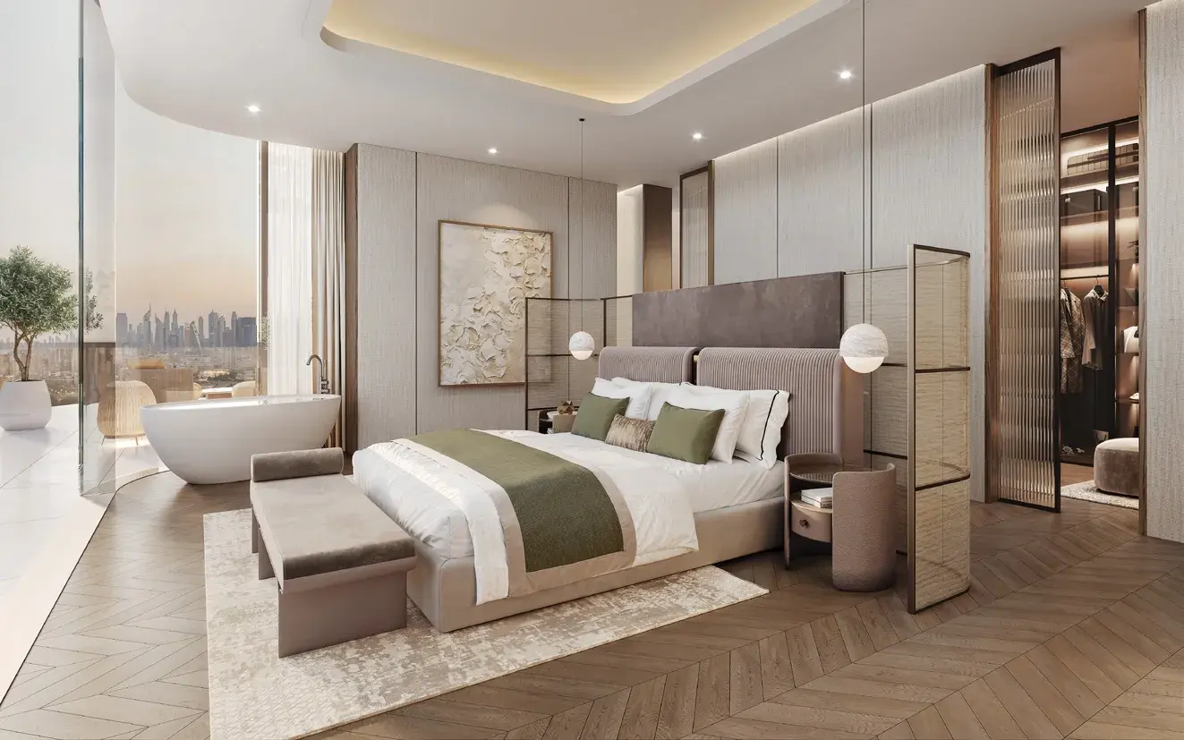Conçue comme un repère architectural, la tour se distingue par ses lignes ondulantes et sa verticalité rythmée, captant la lumière naturelle tout au long de la journée. Chaque appartement bénéficie de vues dégagées sur la mer ou la skyline de Dubaï, invitant à des instants de calme face à l’horizon ou à des soirées baignées dans la lumière de la ville.