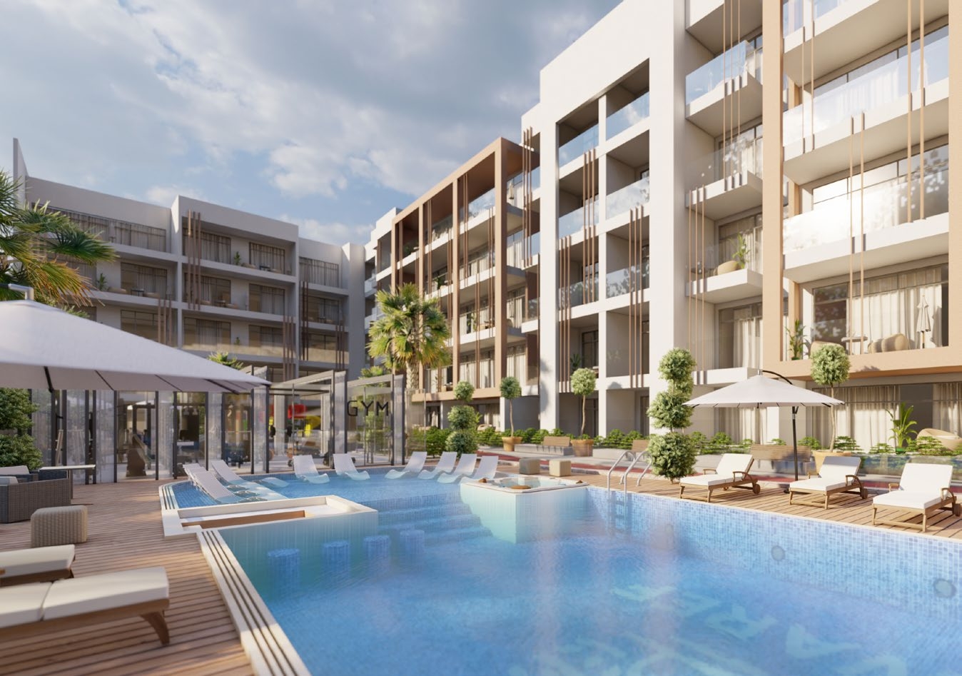 Certains appartements disposent de terrasses privatives avec piscine au rez-de-chaussée, tandis que d’autres bénéficient de balcons avec jacuzzi au cinquième étage. Ces espaces extérieurs pensés pour l’intimité permettent de transformer les instants du quotidien en véritables moments de détente et de bien-être.
